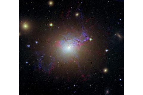 Perseus A, also called NGC 1275, is an eruptive galaxy at the core of the Perseus Cluster, which is made up of some 1,000 galaxies about 240 million light-years away. The dominant member of the Perseus Cluster, Perseus A is a Seyfert galaxy with an active nucleus, powered by a 340-million-solar-mass black hole in its core. (Credit: Hubble Legacy Archive, ESA, and NASA)
