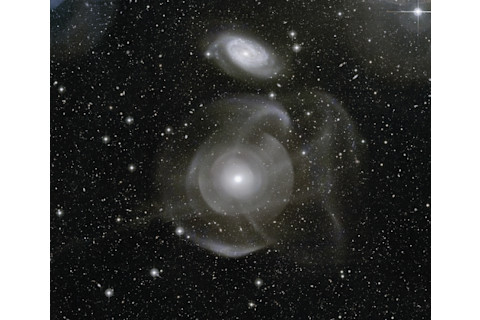 The weirdly distorted elliptical galaxy NGC 474 in Pisces lies at a distance of 100 million light-years. The neighboring spiral galaxy NGC 470 lies just above it. Multiple shells and tidal tails surround NGC 474, caused by interactions with its neighbors and by density waves that propagate through the medium. This mammoth object stretches 250,000 light-years across — two and a half times the diameter of the Milky Way. (Credit: P-A. DUC (CEA, CFHT), ATLAS 3D Collaboration)