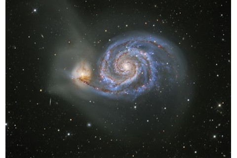 The Whirlpool Galaxy in Canes Venatici, another galaxy near the Big Dipper, is also known as M51 and is a top telescope target. An interacting pair of galaxies, the Whirlpool is being passed by a little interloper, NGC 5195, which is drawing material off one of the larger galaxy’s spiral arms. The pair lies 23 million light-years away, and M51’s disk stretches across 60,000 light-years. (Credit: Tony Hallas)