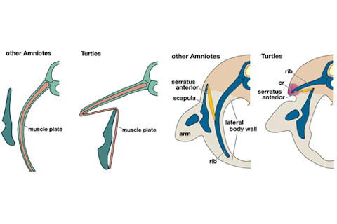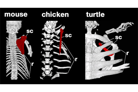 In the turtle, early embryos share the basic plan as those of mice and chickens, but there are subtle differences. The shoulder blade is positioned further forward and the ribs themselves are much shorter, never reaching down into the embryo's flanks. As it grows, things change dramatically.