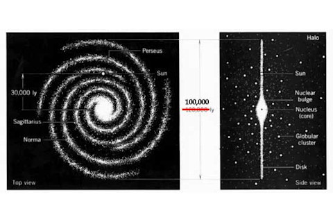 found that our galaxy is twice as thick as previously thought! The Milky Way is a spiral, meaning it's a flat disk. Face on, you can see the glorious spiral arms and the central bulge, with the disk spreading across an impressive 100,000 light years or so.