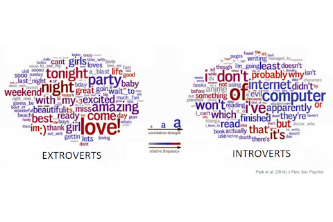 The words you use in your Facebook posts reveal much about your personality, according to psychologists Gregory Park and colleagues in a new study just published. Based on a study of 71,000 Facebook users who reported their personality using an app, Park et al. found some quite unexpected words to be associated with given personality traits. Here are the word clouds showing which terms are most predictive of extroversion and introversion:
