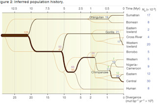 Overall this paper is important because it has reasonable coverage in terms of genomes (hitting a genome at the same putative marker more than 10 times) and populations (sampling a wide array of subspecies from the great apes, N = 79). In the future this sort of analysis will probably be ho-hum, slicing apart a rich data set with a Swiss army knife of statistical genomic analytic techniques (see the supplementary PDF). If you are interested in the complex population history of chimpanzees this paper is for you, as it explores changes in population sizes and admixture and gene flow. For me there are two big results which are of particular importance. First, they did not find that loss of function substitutions were enriched in the human lineage. This matters because geneticists are still poking around for the "gene(s) which made us human." Or perhaps more charitably the evolutionary processes specific and distinctive to our species which results in our uniqueness. I don't deny we're a unique species, but it seems that though this quest will continue for a while longer. That's because