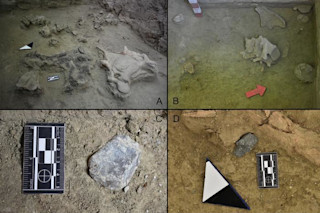 The dominant feature of the site is the fossil remains of a gomphothere, an extinct relative of the elephant. The bones show signs of butchering, and nearby stone tools — including one probably used to scrape the hide — supports that.
