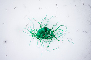 The brown squiggles you see here are ice worms making their living on the surface of the Whitechuck Glacier in the Cascade Mountains of Washington State. These relatives of earthworms---seen here alongside a disintegrating balloon littering the ice---are found only on the glaciers of the North American west coast, where they graze on algae and bacteria. Unlike other animals, the worms have a metabolism that seems to increase at lower temperatures; they typically die above 50 degrees Fahrenheit, and their tissues begin to break down at about 70 degrees. Some glaciers house more than 250 worms per square foot of ice, but as glaciers in the region recede, the worms are expected to disappear along with them. They can be hard to photograph, because they avoid light and mostly appear at night. Photographer Ethan Welty: "I'd found balloons snagged on high peaks in the Cascades before, but there was something particularly alarming about the one I found on Whitechuck Glacier, the juxtaposition of the tangly green appendages of the balloon with the delicate black filaments of the surrounding ice worms." Ethan Welty/Aurora Photos