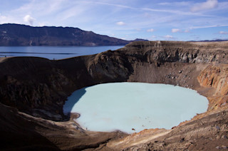 The Askja caldera in Iceland, with Viti crater in the foreground. Note the people bathing in the hydrothermal waters in the crater.