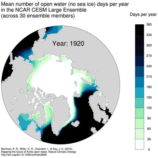 The number of open water days per year — meaning days without sea ice — increases significantly in the Arctic region between 1920 and 2100, according to a new modeling study. (Individual images: Katy Barnhart. Animation: Tom Yulsman) Ice was in the news quite a lot last week. There was, for example, the news that Antarctica could be gaining, not losing, ice, at least for now. Lest you were tempted to breathe a sigh of relief, critics pointed to contrary evidence. And there were also these unsettling findings about the gigantic West Antarctic Ice Sheet. But far to the north, some equally important news unfortunately got less attention. For the long and short of it, see the animation above. I created it to portray in visual form what a study published last week has revealed: Unless we start reining in greenhouse gas emissions, "our projected impact on the climate system will change the face of Arctic sea ice," says Katy Barnhart, who led the study while she was at the University of Colorado's Institute for Arctic and Alpine Research. (Full disclosure: I'm a professor at the University of Colorado.) The animation shows computer model simulations of how Arctic sea ice is likely to respond to continued human-caused warming. More specifically, it models how the number of days of open water change each year from 1920 to 2100 under a "business-as-usual" scenario. By 2100, according to the study, much of the Arctic has greater than 150 additional days of open water as compared with the pre industrial period prior to 1850. But we won't have to wait that long to see significant changes. If greenhouse gas emissions continue to rise, the entire coastline of the Arctic, and most of the Arctic Ocean itself, will see at least 60 additional days a year of open water by mid-century. Some sites will even see 100 additional open water days. Arctic sea ice has already shrunk in geographic extent during the period of modern observations. This has been one of the significant signs and symptoms of human-caused warming. But for people and other species in the Arctic, something else is even more important than an overall, general decrease in ice extent: What's going to happen in their neck of the woods? With that in mind, Katy Barnhart, and her colleagues, sought to produce a detailed forecast of open water patterns in the Arctic. Among the questions they sought to answer were these: