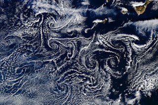 Cloud spirals called Von Karmon Vortices form south of the Canary Islands in the Atlantic Ocean off Africa, as seen in this image from NASA's Aqua satellite captured on Nov. 7, 203. (Source: NASA) While exploring satellite images of the world using NASA's fabulous interactive Worldview application, I found this beautiful pattern of cloud spirals downwind of the Canary Islands, acquired by NASA's Aqua satellite on November 7th. Called Von Karman vortices, they are not all that uncommon. But I've typically seen them in more orderly lines, called "streets," as opposed to the more chaotic and arresting pattern seen here. Call it "cloud art." I wrote about the phenomenon that creates these features in an earlier post, with an accompanying explanatory animation. You can find it here. I also found this striking pattern of clouds above the Indian Ocean just west of Australia, captured by the same satellite on the same day: