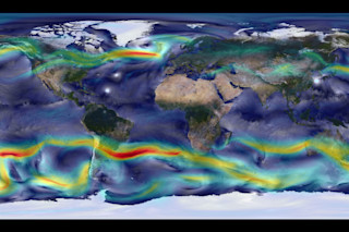 A NASA computer model produced this high resolution simulation of global winds. (Source: William Putman/NASA Goddard Space Flight Center) This beautiful visualization simulates global wind patterns, including jet streams in the Northern and Southern hemispheres, as well as individual tropical cyclones. It was produced by a system of integrated models, called GEOS-5, run on a NASA supercomputer. Click on the image to get a bigger view and look in particular for small white circles in the Atlantic and Pacific oceans. If you look closely, you'll see faint spiral arms. And a dark center is clearly visible in the center of the one located off the coast of China. These are surface winds from cyclones simulated by the model. The other features are upper level winds, with red coloring indicative of the highest speeds. They look like atmospheric rivers — and in a sense, they are: These are jet streams. (For an even higher resolution version of the image, which allows you to zoom in very close to individual features, click here.) http://www.youtube.com/watch?v=FNnIrIuNbeA This second simulation, also produced by the GEOS-5 supercomputer model, visualizes jet stream patterns in the Northern Hemisphere. As it progresses, you'll notice that the jet stream develops big kinks over North America. Some research has shown that warming in the Arctic is contributing to these big jet stream kinks, which in turn tends to cause weather events such as heat waves and extreme rainfall events to stall and therefore linger longer than they otherwise would. (Andrew Freedman explains the research in this story at Climate Central.) By modeling atmospheric wind flows, scientists hope to gain better insights into how climatic factors affect weather. NASA is using GEOS-5 to do much more than simulate global wind patterns. Run on the Discover supercomputer at the NASA Center for Climate Simulation, the modeling system has been simulating weather down to a geographic resolution of just 3.5 kilometers across. Here's how NASA describes the project: