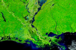 Areas where rivers have overflowed their banks and spread out along their floodplains are rendered in deep blue. The thickest ribbon of blue in the image is the Mississippi, stretching from above Vicksburg, Mississippi, in the north, all the way down to New Orleans in the south.