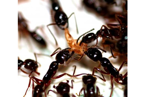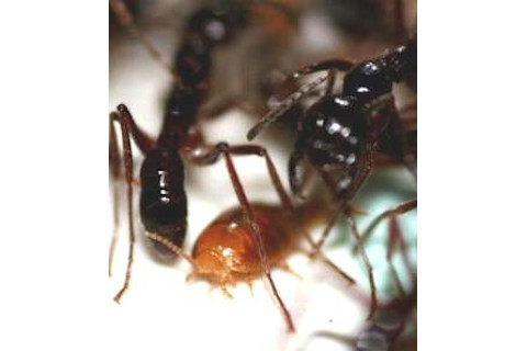 (or CHCs), that the near-blind ants use to recognize nestmates in the dark. It is a dangerous way to live; army ants have keen senses and are usually adept at recognizing intruders, even expelling or killing fellow Leptogenys distinguenda if they smell like they're from a different colony. In the study, the researchers first catalogued all the cuticular hydrocarbons used by the ants, finding 70 in all. Doing the same for the silverfish, they found it made none of its own. They then coated the immature ants in a radio-labeled hydrocarbon similar in structure to others CHCs. They found that the silverfish acquired high levels of this marker after a day spent in close proximity to the callows, which they could be seen rubbing against from time to time. Poor callows—ant tweens old enough to smell right but too young to know the difference between a healthy attena-tap from a nest-mate and the silverfish's unwanted rub-down. In a separate experiment the researchers also isolated silverfish for about a week, and found that levels of these ant-smelling chemicals gradually decreased. They then compared the interactions of army ants with isolated and non-isolated silverfish. As predicted, the ants responded more aggressively to the isolated parasites, snapping at or attacking them about five times more often. If the results stand up, it will be the first demonstration of an ant imitators acquiring all of its CHCs from the ants themselves. Several other types of so-called myrmecophiles have been show to synthesize chemicals