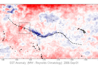 There's still not much news yet out of Wake Island, other than that there aren't any oil spills (um, why would there be?) But Hurricane/Supertyphoon Ioke left a different kind of, er, wake than its destruction of Wake. This incredible storm churned lots of cooler water up from below the ocean surface, as you can see in the sea surface temperature anomaly picture above from Remote Sensing Systems. A storm's capacity to mix up the oceans is, of course, proportional to its power. And Ioke had a hell of a lot of power at its height. Some scientists have even speculated that this type of cyclone-induced ocean mixing plays a significant role in heat transport by the oceans, and therefore, in regulating global climate. I'm not a scientist, but for me, looking at Ioke's dramatic cold wake helps make that idea believable.