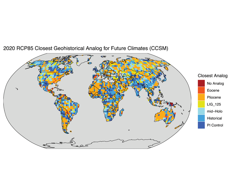 This animation depicts climatic conditions out to 2280 assuming emissions of greenhouse gases are not restrained. The color coding shows how future conditions would compare to past climates, with lighter orange corresponding to the Pliocene Epoch about 3 million years ago, and darker orange to the Eocene about 50 million years ago. Dark red indicates future climatic conditions with no past analog. (Source: "Pliocene and Eocene provide best analogs for near-future climates," K. D. Burke et al, Proceedings of the National Academy of Sciences Dec 2018, 2018) Absent serious action on climate change, we'll continue careening toward a climatic cliff. And modern civilization will be hard-pressed to survive the plunge. This is the essential take-away from new research probing Earth's climatic past to yield insights into our future. The research finds that if our emissions of carbon dioxide and other greenhouse gases continue unabated, Earth's climate will warm by the year 2150 to levels not seen since the largely ice-free Eocene Epoch about 50 million years ago. That may seem like a long time on a human timescale. But consider that the research shows we're currently on course to reversing 50 million years of cooling in just a couple of centuries. That may be so rapid that it will outpace our ability to adapt our agricultural and other modern life support systems. Thanks to our emissions of greenhouse gases, "the Earth system is well along on a trajectory to a climate state different from any experienced in our history of agricultural civilizations," write Kevin Burke and his co-authors in a paper published in the Proceedings of the National Academy of Sciences. Here's why that's troubling: Modern human civilizations, made possible by agriculture, have thrived in what scientists term "a safe operating space," meaning a stable, relatively benign climate. But now, staying within that safe space seems to be "increasingly unlikely," the researchers write. "If we think about the future in terms of the past, where we are going is uncharted territory for human society," says the study's lead author, Kevin Burke, in a press release. Burke led the research while he was a graduate student in the lab of paleoecologist John "Jack" Williams of the University of Wisconsin-Madison. "We are moving toward very dramatic changes over an extremely rapid time frame, reversing a planetary cooling trend in a matter of centuries," Burke says.