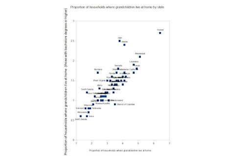 I recently noted that the SDA Archive has an American Community Survey interface. The ACS has huge sample sizes because the US government can afford to do extensive surveys. And naturally you find some really interesting facts. For example, there's a variable which tells you about the presence of grandchildren in the household. In some nations this wouldn't be a big deal, but in the USA it is not too common. You can also look at this by state, which is what I did. Then I compared the total proportion to those limited with college degrees or higher. No surprise, those with college degrees tended to be less likely to have grandchildren living at home.... But can you guess which state has the highest proportion of grandchildren living at home? And which states deviate from the trendline? Surprises to me....