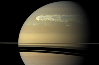 While Saturn’s major storms are not as persistent as the Great Red Spot, they splash across the ringed planet in dramatic fashion. Every 20 to 30 years, they spin up like massive hurricanes and swirl their way around the planet, though no one knows for sure what causes them. The last such megastorm broke out in 2010 and persisted for more than six months, long enough for the Cassini probe to study it.
