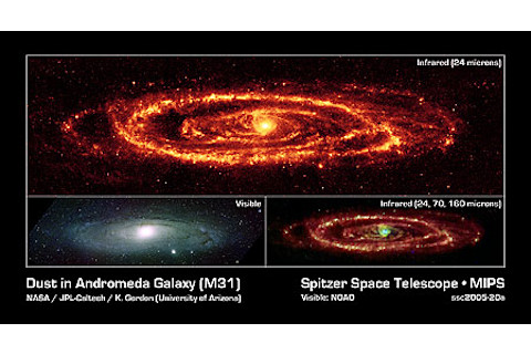 NASA's infrared Spitzer satellite has released these gorgeous new images of the Andromeda galaxy. In infrared, you are directly observing the dust lanes that describe the galactic arms, rather than simply looking at reflected starlight.