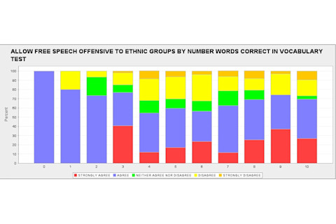 Here is what I found.... 1) Across politics there doesn't seem to be a strong trend. Extreme liberals do tend to go bimodal where a large minority support speech restriction, but the N is small. Interestingly, moderates are the most open to speech restriction. Perhaps because moderates are the least like to need protection because they're so inoffensive ;-) 2) A very moderate trend while increasing intelligence and free speech absolutism. But far less than I'd expected. 3) A rather noticeable trend toward free speech absolutism from junior college on up in terms of education...but the N for junior college isn't large. It seems actually the trend is weaker than I'd thought it would be here, the less educated aren't that much more open to speech suppression! 4) Little difference across races. 5) Some differences across regions. I checked a few other variables. There doesn't seem to be much difference. I'm pretty surprised, and happily so! Someone else can check the regression or correlations, but where there are trends the N's are suspiciously small for those categories, so I'm skeptical that there will be many statistically significant differences. The tables are below the fold.