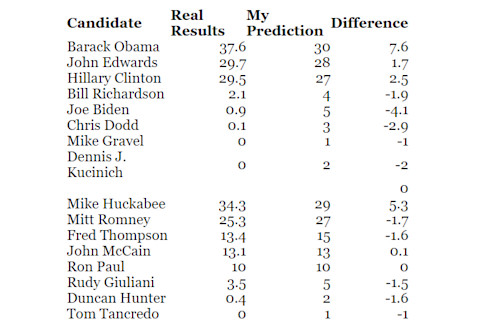 How did I do? First, I got the rank order pretty much down! The only mistake was swapping Richardson and Biden. Second, I didn't know how the Iowa Democratic Caucus was set up...otherwise, I would have been retarded to not assume it would have taken a "Winner Take All" outcome due to the 15% threshold. Below the fold, with 100% and 96% of precincts for Dems and Repubs respectively. New Hampshire predictions forthcoming!