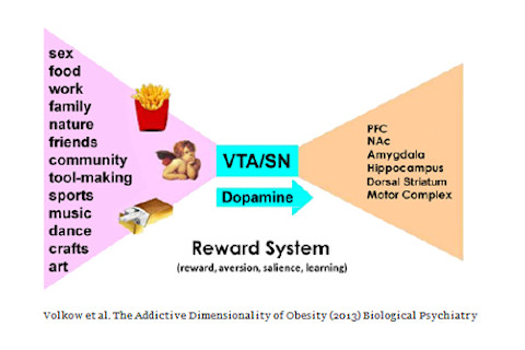And it goes on in this vein. Volkow et al's is a good paper as far as it goes. It's an interesting and accessible review of the relevant literature. The dopamine theory of addiction is extremely popular today, and this article is a fine statement of it. Leaving aside the question of how true this is, what worries me is the implications of this idea. If you view addiction as essentially about reward (pleasure), surely that means that anything pleasurable could also be addictive? Or to put it another way, if you're saying that addiction is the direct consequence of over-indulgence in a reward, then aren't you saying that rewarditself is ultimately what's addictive? After all, drugs and food aren't the only rewarding things. Indeed, according to Volkow et al, everything good in life is a reward and they all act on dopamine. Here's what the authors call a 'bow-tie diagram' which I think is a nice illustration of their approach (and its limitations):
