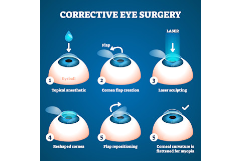 With LASIK, a physician uses a blade or a laser to make a circular flap in the top layer of the cornea. The flap is pulled back, and the physician uses a laser to reshape the corneal tissues as needed. The flap is then placed back into position. The procedure takes about 10 to 15 minutes per eye.