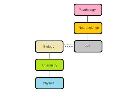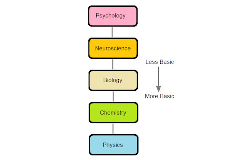 On this view, physics forms the base of the ladder because it deals with the simplest building-blocks of matter, atoms and subatomic particles. Chemistry is next up because it studies interacting atoms i.e. molecules. Biology studies complex collections of molecules, i.e. cells. Then comes neuroscience which deals with a complex collection of interacting cells – the brain. Psychology, perhaps, can be seen as the next level above neuroscience, because psychology studies brains interacting with each other and with the environment.