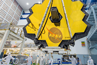 Technicians at Goddard Space Flight Center in Greenbelt, Md., position the massive James Webb Space Telescope for tests in its assembly room earlier this year, in preparation for a 2018 launch. While Webb will be the most powerful space telescope ever built, astronomers are already designing its successor. The High Definition Space Telescope will have a mirror nearly twice the diameter of Webb’s 21.3-foot gold mirror and should be powerful enough to detect evidence of life on alien planets.