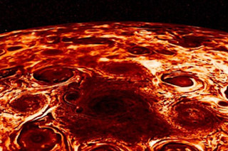 The most dramatic findings may be Juno’s views of the north pole of Jupiter. Because it used infrared light, which plows through dust and other impediments to visible light, the probe’s data give researchers an unprecedented and penetrating view — up to 45 miles below the planet’s clouds. A spectacular and violent scene awaited them: a bevy of cyclones, 2500 to 2900 miles across, centered on the pole. NASA, slick as always, has turned the data into a quick jaunt over the 3-D rendered landscape. https://www.youtube.com/watch?v=nr5Pj6GQL2o