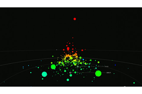 In this image, the size of the dot is proportional to the size of the planet, while the distance from the center is proportional to the distance at which its orbiting its star. The color and height measure the same thing, the temperature of the planet. (Greenhouse effect not included.) Here's a video that offers transitions between different presentations of the data. Unfortunately, it's kind of hard to read the labels on the various axes unless you go to the HD version. [embed] http://vimeo.com/19642643 [/embed] A couple of science results pop out -- you could have figured them out without the visualization, but it makes it much easier. First, most of these planets are closer to their stars than Earth is to the Sun. Second, most of the planets are equal to or a bit larger than the Earth. Both features make sense in terms of Kepler's search technique -- the mission looks for tiny dips in the brightness of stars as planets pass in front, which favors larger planets with shorter orbits. It's unclear whether the overall planet distribution also shares these features.