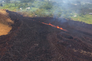 UPDATE 8:30 PM ET May 18: Here is a livestream of the activity at Fissure 17 (thanks to the USGS) [embed]https://www.youtube.com/watch?v=SEcLitBiGhY[/embed] UPDATE 9:15 AM ET May 19: The new pahoehoe lava flow from fissure 20 has been moving over 200 meter per hour and have separated into three lobes. The lava flows from the newer, eastern part of the fissures do appear to be flowing faster than the early flows, suggesting they could be hotter. This image below shows the extent of the fissures across Leilani Estates: