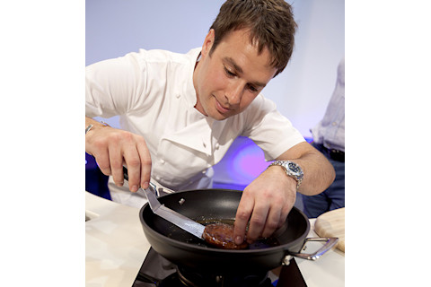 Today’s London launch was a spectacle. In front of an invite-only press crowd and a professional television crew, celebrity chef Richard McGowan faced the cultured-beef creation. The patty looked like a normal burger. We were informed that breadcrumbs and binder had been added, as well as saffron and red beet juice for coloring. McGowan placed the patty in a pan, along with rather healthy doses of sunflower oil and butter.