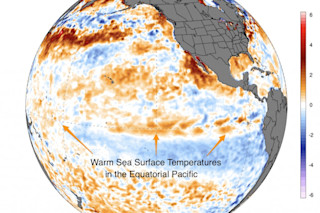 Departure from average of the surface and subsurface tropical Pacific sea temperature averaged over 5-day periods starting in early June 2018. The vertical axis is depth below the surface in meters, and the horizontal axis is longitude, from the western to eastern tropical Pacific. The cross-section is along the equator. (Source: Climate.gov figure from CPC data.) "It’s likely the surface will continue to warm over the next few months, helping to support the forecast for El Niño’s development," writes research scientist Emily Becker in a post at the ENSO Blog. She also notes that "most climate climate models predict that the Niño3.4 region temperatures will reach the El Niño threshold . . . by the fall." If the models and forecasters are right and El Niño does develop, we should expect one other impact that I'm sure would be an unpleasant prospect for the millions of Americans who have been sweltering in recent weeks: a boost in global temperatures. This would come on top of the rise in temperatures from human-caused global warming. Thanks in part to a boost from a particularly strong El Niño in 2016, that year obliterated the record for warmest year. Thank goodness there are no indications now that we're heading for an El Niño that strong. Forecasters are actually expecting it to be in the weak to moderate range. Let's hope that will mean only a modest boost to global temperatures — but a nice influx of desperately needed moisture to drought afflicted areas.