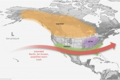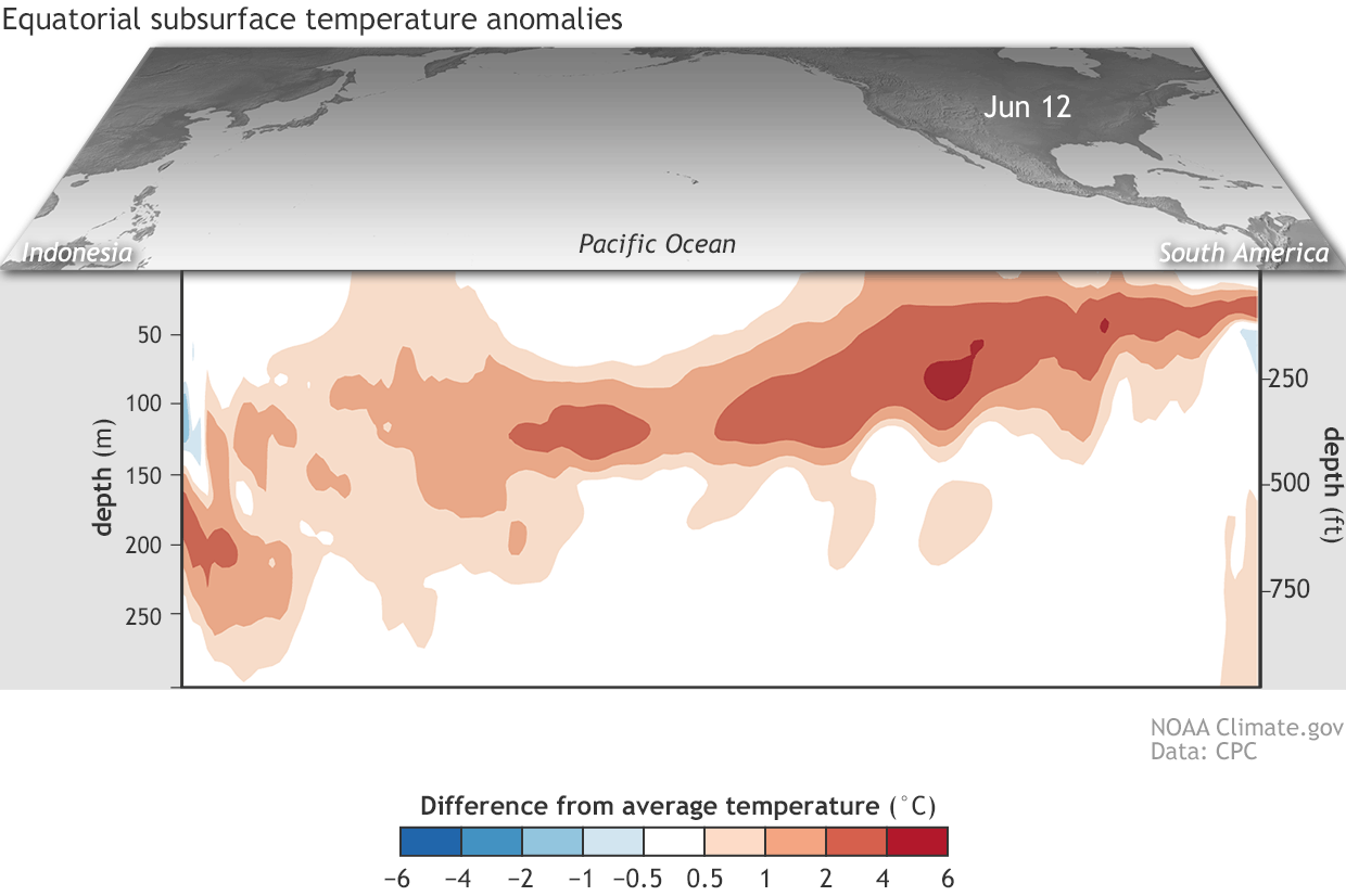 El Niño weather impacts. (Source: NOAA) This is important because El Niño has profound impacts on weather around the world. Here in the United States, El Niño tends to result in an amplified winter storm track across the southern tier of the country. This usually brings wetter conditions — including to southern California and portions of Nevada and Arizona, areas now afflicted by severe drought. Click on this map to see typical winter weather impacts during El Niño episodes. The atmosphere is an incredibly complex and chaotic system. So we shouldn't expect to see all of the impacts shown in the map — which is about probabilities, not certainties. But more than half of all El Niño events since 1950 have brought wetter than average conditions to California. What has happened to cause forecasters to feel more confident that an El Niño will develop? The climatic phenomenon is characterized by a number of changes in the tropical Pacific region, most especially warmer than average sea surface temperatures in a swath along the equator known as the Niño 3.4 region. And, in fact, temperatures along the equator have been edging up, as the map at the top of this post shows. In that Niño 3.4 region, sea surface temperatures must rise 0.5°C above the long-term average to cross the El Niño threshold — and right now, we've still got a ways to go. But a huge blob of warm water beneath the surface of the Pacific has been rising from the depths, helping to raise temperatures at the surface: