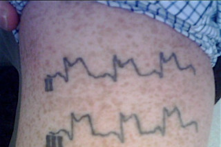 Carl writes: When you stop to reflect on electrocardiograms, it is remarkable that we can peer within the heart simply by picking up tiny changes in voltage on the skin. The fact that muscles such as the heart use electricity to drive their contractions was inconceivable in the 1600s. Natural philosophers believed muscles might be inflated by "animal spirits," but the idea that the same power in a lightning bolt was at work in our hearts every second of our lives would have seemed absurd. Jan Swammerdam, a Dutch anatomist, tried to persuade his contemporaries in the 1660s that animal spirits did not drive the heart--he showed that a severed muscle twitched if he touched its nerve endings with the blade of a scalpel--but it would take well over a century for scientists to accept that our lives depend on a rhythm of sparks. Click here to go to the full Science Tattoo Emporium.