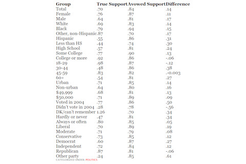 To a great extent I think this is the sort of thing which should give us caution about overreading from social science; you might not be smoking out the dynamics which you think you are smoking out. I've put the results from the most relevant table below the fold; remember that "True Support" is a calculated projection, and if you are curious about p-values just go to the paper itself.