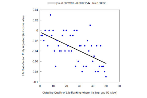 Basically they constructed an index of quality of life based on objective metrics. They then compared how those metrics related to surveyed subjective happiness, and came up with this 50 state scatterplot: