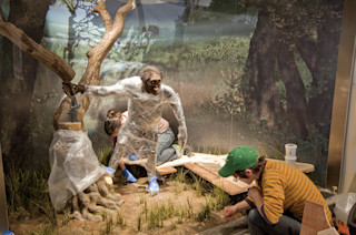 Exhibition model makers working to fit sculptor John Gurche's life-sized recreation of Lucy onto the model tree in the Lucy diorama section of the David H. Koch Hall of Human Origins at the Smithsonian museum in Washington. Lucy (Australopithecus afarensis) was discovered in Hadar, Ethiopia in 1974 by Donald Johanson and Maurice Taieb. Lucy was nicknamed that very night as Donald Johanson’s team celebrated to the Beatles’ hit “Lucy in the Sky with Diamonds.” Her Ethiopian name, "Dinenesh," is Amharic for "you are beautiful." Courtesy Chip Clark/Smithsonian Institution