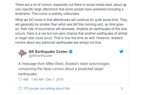 Also, rumors of potential “predicted” larger earthquake to follow are false (as are any places that claim they “predicted” it in the first place. You can read statement from the Alaska State Seismologist:
