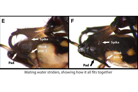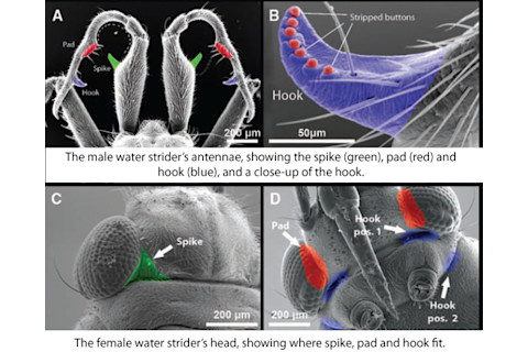 The worst sex you have ever had pales in comparison to what female water striders have to put up with. Put it this way: you have never been held down by your eyes. As the female skates over the surface of ponds and lakes, males will try to force themselves upon her. She resists by struggling vigorously. But in some species, males can avoid being thrown off with antennae that have evolved into antler-shaped restraints. They bend in on themselves and are loaded with an array of prongs and spikes that perfectly fit to the shape of a female’s head. Locke Rowe from the University of Toronto has been studying water striders for almost 20 years. In many species, males have evolved structures that give them an edge in their indelicate liaisons with females. “But the traits I studied before were rather simple – a spine here or there,” says Rowe. The subject of his latest study, a species called Rheumatobates rileyi – is… well, the opposite of simple. [embed width="610"]http://youtu.be/DOgSIXQu06I[/embed] The females have normal antennae. The males however, have “spectacularly modified grasping devices”, says Rowe. “They’re large, muscular, and fitted with spines and spikes exquisitely adapted for grasping – a long way from an insect feeler.” Together with postdoc Abderrahman Khila and colleague Ehab Abouheif (remember the supersoldier ants?), Rowe has pieced together how the bizarre antennae work and how they evolved. They watched mating water striders using high-speed cameras and powerful electron microscopes. This voyeurism revealed that the male antennae have four structures for clinging onto struggling females.