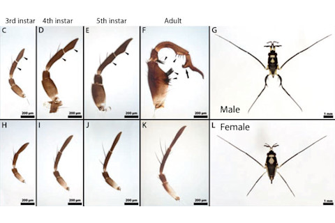The fit between the male’s antennal adornments and the female’s head and body is uncannily precise. These special traits appear very late during the male’s development. For most of his larva-hood, his antennae look like chunkier versions of a female’s. It’s only during his final moult, when he sheds the skin of youth and transforms into an adult, that he gains the wrench, spike, pad and hook. To understand how the antennae evolved, Khila catalogued the genes that are activated in the antennae, as males and females approach adulthood. One gene drew their attention – distalless (dll), which helps to control the growth of insect limbs and bristles. Khila deactivated the dll gene before the water striders’ final moult, using a technique called RNA interference (RNAi). Females were unaffected, but the males lost many of their deluxe antennal features. In the most severe cases, their antennae were virtually indistinguishable from those of females. In milder cases, the special features were just smaller than usual. This is typical for RNAi – it has stronger effects in some individuals than others. But this gave the team the chance to test how essential the male’s features are. By pitting them against females, the team found that males with the most severe reductions were the worst suitors. They were more easily bucked off. The more elaborate the antennae, the more successful they were This is the first time that anyone has taken a trait that obviously differs between male and female animals, showed how that difference benefits one sex, and worked out the genes that cause that difference. It’s a tour de force set of experiments. It’s also a great example of how tiny changes to amass into impressive traits. Even a slightly more elaborate antenna makes a male better at fertilising a female. “Each little step increased its mating success with resistant females, and this is what accounts for its evolution to its current spectacular state,” says Rowe. It’s not clear how dll produces the weird antennal structures, or why it only does so in males. The gene is much shorter in R.rileyi than in other water striders without weird antennae, which might provide a clue. Rowe also thinks that timing is important. “Late in development, the gene is doing very little or nothing else, other than modifying antennae,” he says. This allowed evolution to shape the male’s antennae without messing up other body parts that are under dll’s control. It also allowed the team to switch off the gene without creating monsters.