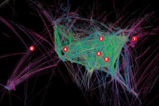 Recent UCLA graduate Aaron Koblin collected latitude, longitude, and altitude data of U.S. and Canadian flights from March 19, 2005, through the early morning of March 21, 2005. After parsing and plotting the enormous chunks of information, Koblin ended up with this depiction of 28 hours' worth of air traffic. In all, the number of flights recorded by the Federal Aviation Administration was more than 20,000.