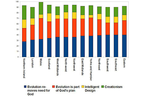 Below is a map with the regions labeled. Wales is blue because it is the only region where theist evolution is plural majority (all other areas have atheistic evolution as the majority position).