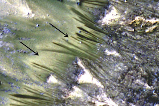 The orbiting HiRISE camera captured these seasonal flows, which sure look like flowing water. | NASA/JPL-Caltech/University of Arizona