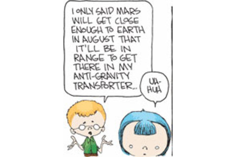I've been getting a steady trickle of emails from folks pointing this out to me. If you haven't seen it yet, you will; it claims that in August Mars will be closer than it has been for thousands of years, and will look as big as the Moon in the sky, yadda yadda yadda. I tire of debunking this every freaking year, so just read this post from last year, or from 2007, or 2006, or 2005, or 2003, when this evil viral thing got started by someone who I hope is now covered with a copious slathering of honey and ensconced in the ground near a fire ant mound, preferably surrounded by quicksand, a tar pit, and a bunch of TV sets all tuned to the Oprah show. And I'm glad Non Sequitur gets it. Note the tags on the comic!
