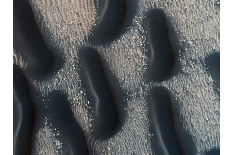 [Click to barsoomenate.] If I told you those were bacteria under a microscope, you might believe me for a minute or two. But actually, those are sand dunes on Mars! Yup. It's funny how bizarre and alien Mars can be. What you're seeing in this image from the Mars Reconnaissance Orbiter HiRISE camera is actually two different kinds of sand: the dark stuff in the big dunes is actually made of grains of gray basaltic sand. They're heavy and pile up into dunes. The ripply pinkish stuff between the dunes is made of smaller grains of sand laden with iron oxide -- rust! The wind can shape those grains more easily, so they can form more gentle, smaller wavelike patterns. This is also why dust devils on Mars leave such amazing and intricate patterns. Still, those dunes really look like microbes... and hey, wait a second. There are a set of characteristics that living things share: the ability to consume, excrete, multiply, and show complexity. Sand dunes consume, in a way: the wind brings in more sand to build them up. The excrete, too, by losing sand. They can grow, and split in half, making more. And in point of fact, they do show emergent complex behavior. Maybe the dunes share more than just appearances with bacteria...could sand dunes actually be [dun dun dunnnnnn] alive*?