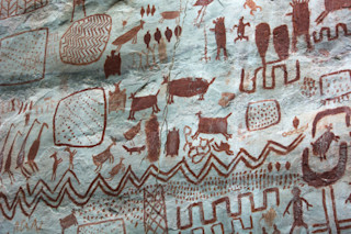 Around 13,000 years ago, humans made their way into the Amazon Basin region of South America, imparting distinct traces of culture such as massive ochre cave paintings.