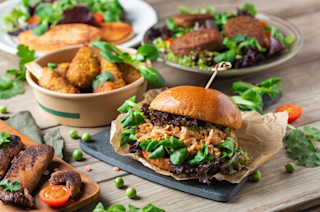Most meat replacements are derived from soy protein because it is relatively cheap and easily absorbs both water and fat, binding these substances so they don’t separate. Some companies will use other proteins, such as wheat gluten, legumes – lentils, chickpeas, peas, beans – and proteins from seed oils.