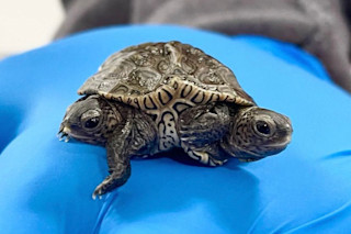 What has two heads and six legs? An adorable diamondback terrapin baby turtle found in Barnstable, Massachusetts. The hatchling was discovered by the Barnstable Department of Natural Resources after it hatched this past fall. They run a head start program that protects the endangered terrapin turtle — the only North American turtle species that lives in brackish water, which is less salty than sea water.