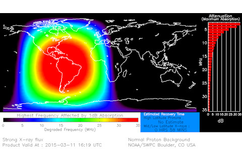 The map above shows the area of the sunlit side of the Earth where radio blackouts would have occurred. According to the Space Weather Prediction Center here in Boulder, Colorado, it was strong event — meaning high-frequency radio communications were affected across a wide area, with loss of radio contact for about an hour on the sunlit side of Earth. From the SWPC: