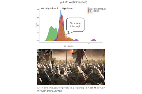Here we see an 'avalanche' of blue, red and purple money priming experiments clustered just outside the grey funnel. This funnel represents null results (no money priming), so the studies just outside it are ones in which significant evidence for money priming was found, but only just (i.e. p-values were just below 0.05). This is evidence of publication bias and/or p-hacking. The original avalanche plot, by the way, was created by Shanks et al. from a different social priming dataset. Vadillo et al. also show an alternative visualization of the same data. The plot below shows the distribution of z-scores, which are related to p-values. This shows an extreme degree of "bunching" to one side of the p=0.05 "wall" (which is arbitrary, remember) seperating significant from non-significant z-scores. It's as if the studies had just breached the wall of significance and were pushing through it: