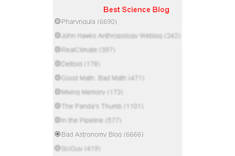 It's like the Number of the Beast, but with an extra 6! That means Extra Evil Added. Mwahahahahahaha! Friday is the last day to ensure that the invertebratofascists don't cross our borders! Bad Astronomy and Pharyngula are less than one percentage point apart, so literally every vote counts here. Vote! Oh, and on Friday I will post the list of links to everyone who shilled for me. I expect I'll be up late tonight typing that entry up.